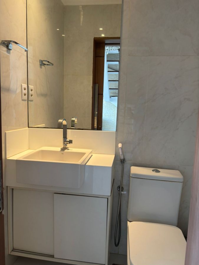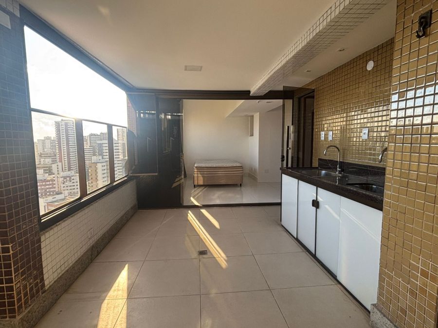 Cobertura 2/4 sendo duas suítes, 2 vagas de garagem, 2 lavabos, 1 cozinha com sala integrada, 1 área gourmet coberta e um terraço.